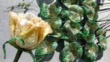 После того, как бутон будет готов, вам нужно присоединить чашелистики, а стебель обмотать зелёными нитками мулине. После того как вы присоединили заготовки листиков, вам нужно покрыть весь стебель акриловой краской.