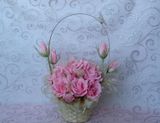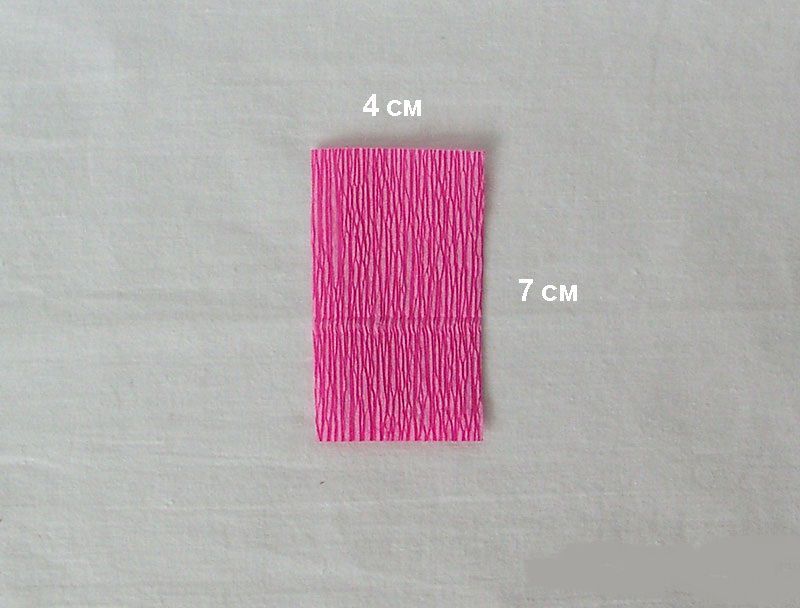 Для этого подготовьте кусок гофрированной бумаги розового цвета, размером 8 на 7 см. Придайте ему форму такую же. как изображено на фото.