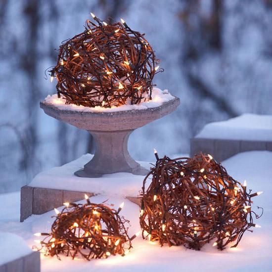 По полученному контуру равномерно распределите гирлянду, стараясь, чтобы лампочки смотрели наружу. Отдельные участки гирлянды закрепите проволокой или утяжками-застежками,обрезав кончики.