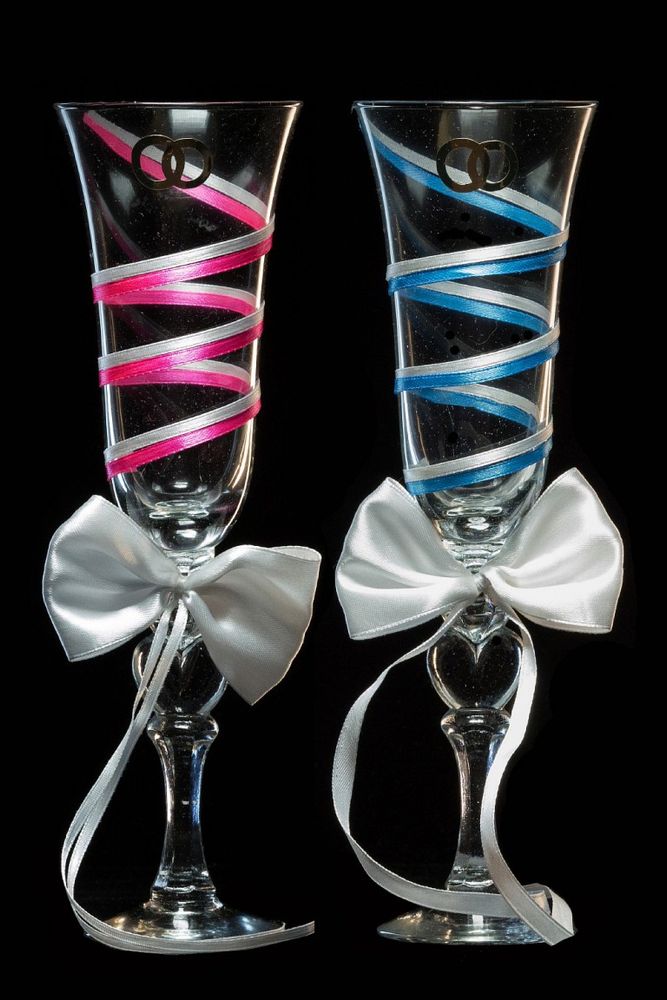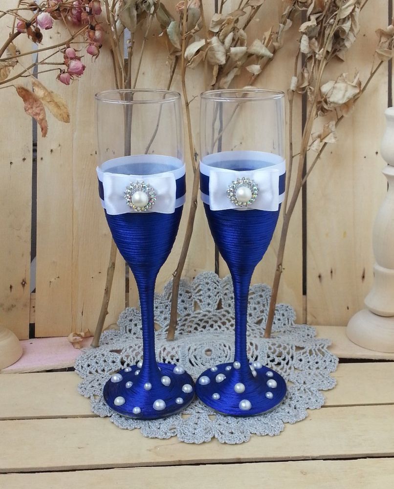 Ножки бокалов можно также задекорировать лентами и дополнить бантиком. Не забывайте о бусинках, стразах и бисере.