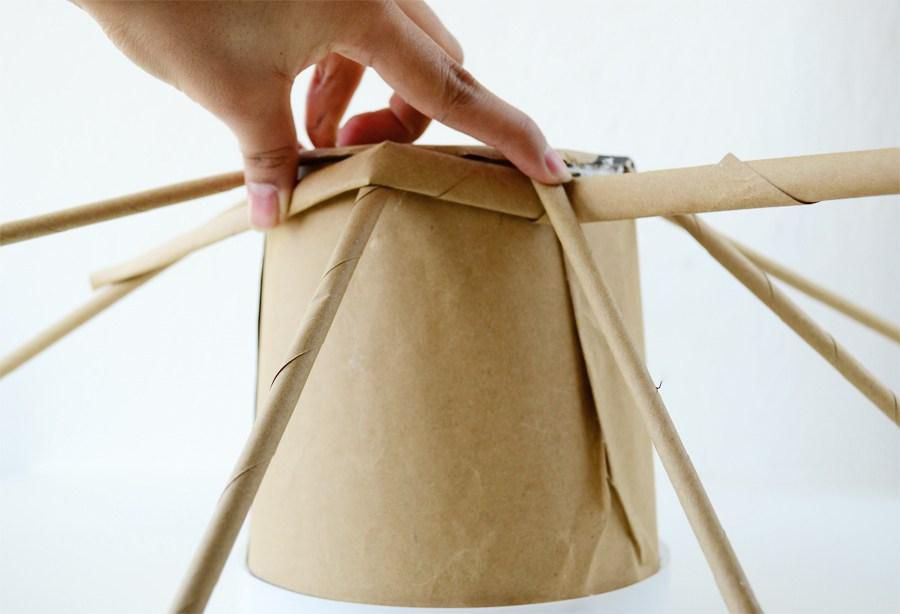 Загните основные трубочки, чтобы они были прижаты к стенкам горшка. Длинную бумажную трубочку приклейте к нижней части горшка и начните наматывать ее вокруг горшка, оплетая основные трубочки.