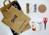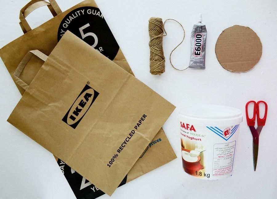 Подготовьте пластиковую емкость или цветочный горшок подходящего размера. Обклейте его бумагой из бумажного пакета, так пластик не будет виден через зазоры.