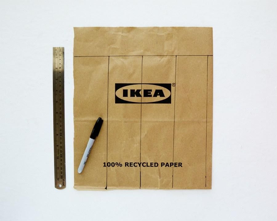 Приготовьте несколько бумажных пакетов. Расчертите на них полоски 7×30 см. Нам таких бумажных полосок понадобится 8 штук. Разрежьте бумажный пакет по линиям разметки.