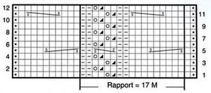 1-й ряд: 2 кромочные, 9 лиц., 2 изн., 2 петли вместе, накид, 2 лицевые, 2 изн. Повторить узор дважды х 17 петель, 2 кромочные петли в конце.