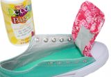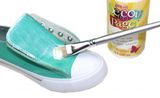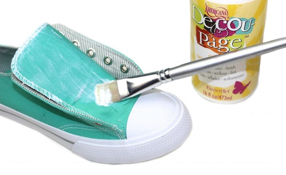 Снимите шнуровку. Затем размажьте клей с помощью кисти по язычку кроссовка.