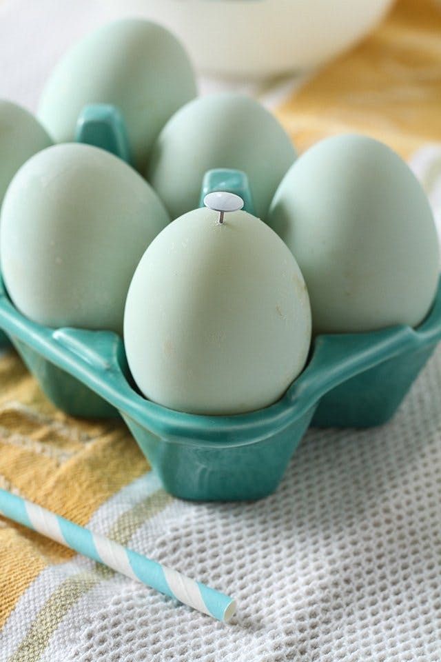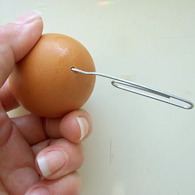 1. Держите яйцо вертикально, проколите кнопкой отверстия в верней и нижней точке яйца. Старайтесь держать яйцо за верх и низ, чтобы не раздавить, сильно не сжимайте.