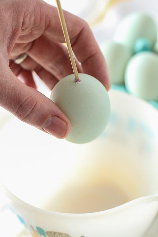 2. Теперь нужно расширить отверстия. Вставьте зубочистку в отверстие, сделанные кнопкой и шевелите вокруг него, чтобы сделать отверстие больше, чтобы вставить соломинку или шприц. С одной стороны яйца сделайте отверстие больше, с противоположной меньше.