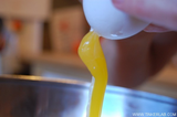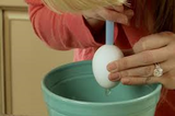 Держите яйцо над широкой чистой миской. Приставьте трубочку к меньшему отверстию и дуйте воздух.