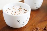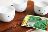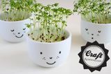 Нам понадобятся одинаковые монохромные чашки, белые, желтые, розовые - выбирайте по своему вкусу. Когда салат вырастет, чашки со свежим урожаем приобретут вид смешных мордашек с зелеными волосами.