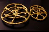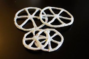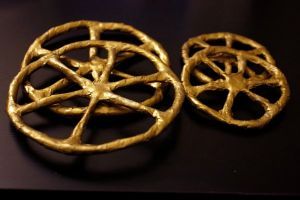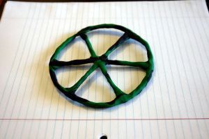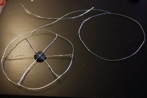 На начальном этапе работы над каретой создаются колеса. Для этого берется проволока и скручивается в виде кольца. При помощи нескольких прутиков делаются перекрещивания, чтобы получились спицы. Размер задних колес должен быть больше передних. Для более надежной фиксации спиц скрепите их пластилином или перекрутите между собой.