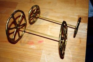 После этого заготовки должны хорошо просохнуть. Когда заготовка полностью высохла, следует переходить к покраске колес в золотой цвет. Чтобы изготовить вал для колес, измерьте ширину тыквы и отрежьте соответствующий этому параметру прут из проволок или шпажки.