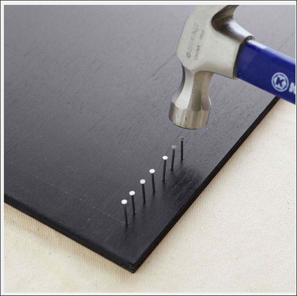 Шаг 1. Возьмите эскиз и, если он такого же размера, как будущий рисунок, то прямо на него вбивайте гвозди по периметру. Если же нет, придется немного пофантазировать и расставить гвозди на собственный манер.