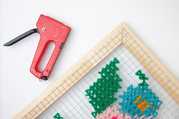 Вставьте проволоку готовой вышивкой в подрамник, приколачивая концы проволочного рулона молотком.