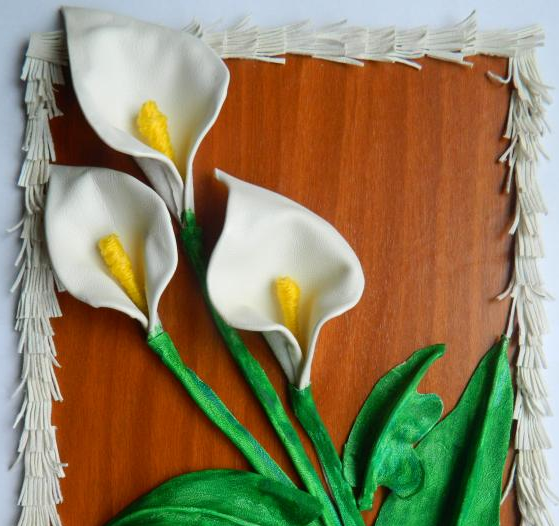 Вот и все! Работа практически закончена. Осталось подождать, пока картина окончательно не высохнет. В итоге у вас в наличии замечательная композиции из искусственной кожи «Букет. Каллы».