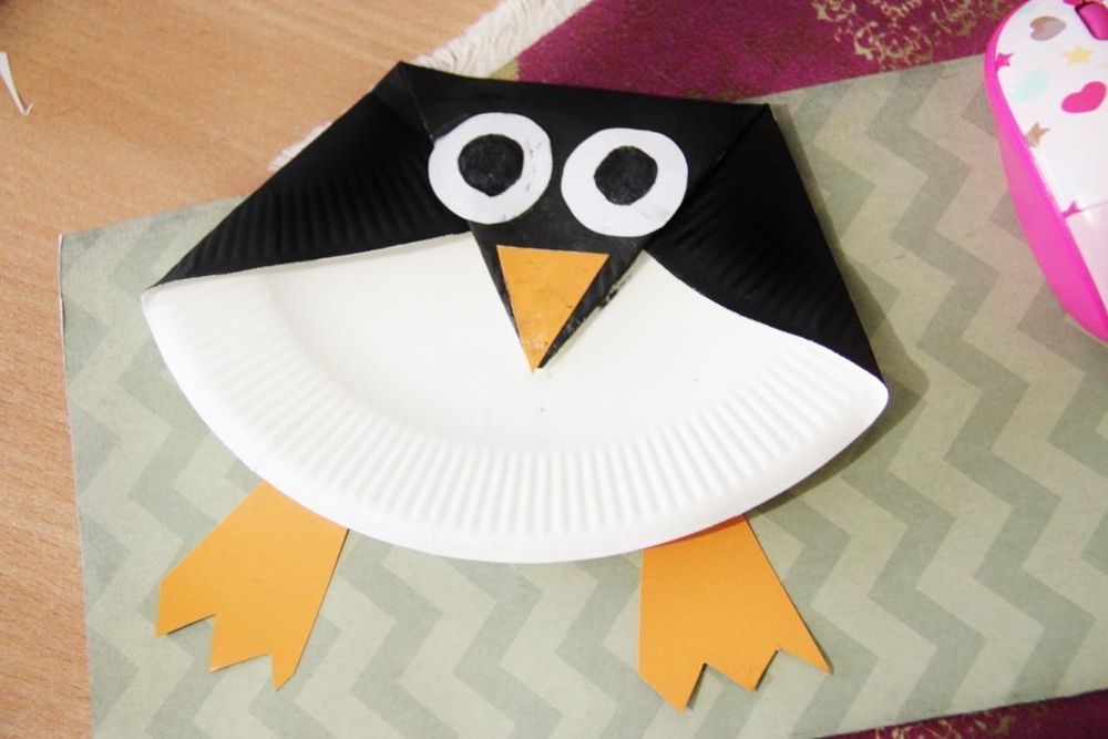 Вырезаем глаза, нос и лапки. После того как гуашь высохла, приклеиваем глаза и нос. Снизу к тарелке приклеиваем лапки. У нас получился добрый и милый пингвиненок, который очень понравится вашему ребенку.