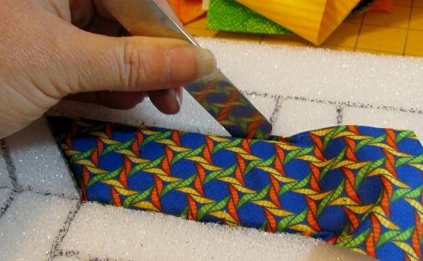 Теперь очередь палочки или пилки, с ее помощью заправляем ткань в пенопласт. Заполняем всю картину.