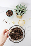 Пока кокосовое масло тает, смешайте сахар и кофейную гущу вместе в миске. Добавьте смесь в растопленное масло, туда же добавьте и ваниль все хорошо перемешайте.