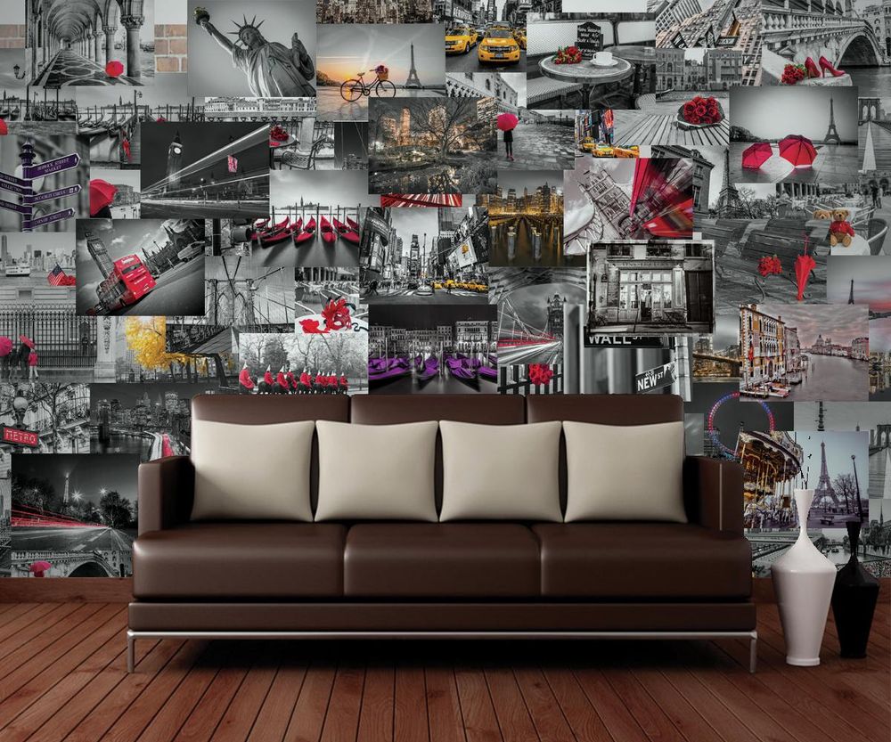 Еще интересно будет смотреться обыгрывание элемента одного цвета на фото. Закажите монохромные постеры, только пусть там буде выделяться одна деталь. И составьте из таких "кирпичиков" целую стену. Взгляд невольно будет задерживаться на каждом ярком пятне.