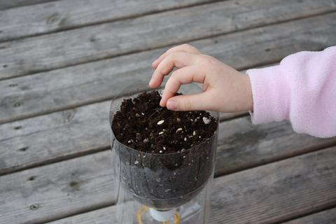 Закрутите крышку на верхнюю часть бутылки и вставьте в нижнюю часть. По мере того как растут растения и используют воду, вы можете просто снимать верхнюю часть, чтобы добавить воды, при этом не поливая поверх почвы. По мере высыхания почвы, вода будет всасываться через нить.