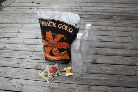 Вам нужно 2 литровые бутылки, почва, семена, толстая пряжа, крестообразная отвертка, молоток, нож или ножницы, чтобы разрезать бутылку.