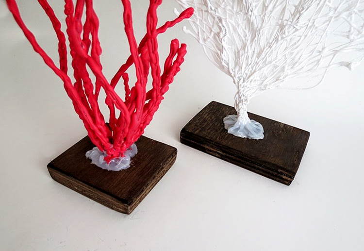 Для того, чтобы изготовить основание, возьмите кусок дерева и зафиксируйте проволоку на нем. Используйте гвозди и клей. Для того, чтобы скрыть место фиксации у основания и красиво обработать, нанесите слой клея и покрасьте краской того же цвета, что и кораллы.