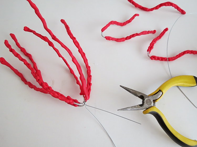 Для крепления коралла к деревянному основанию, скрутите проволоку и сделайте ножки.