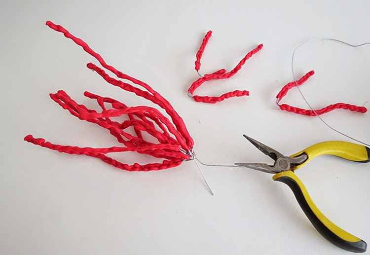 После этого вы можете начать собирать свои кораллы. Возьмите 2 или 3 элемента и обверните вокруг проволокой, чтобы скрутить их вместе. Добавьте еще 1 или 2 части и снова скрутите и так далее, пока все эти элементы не будут соединены.