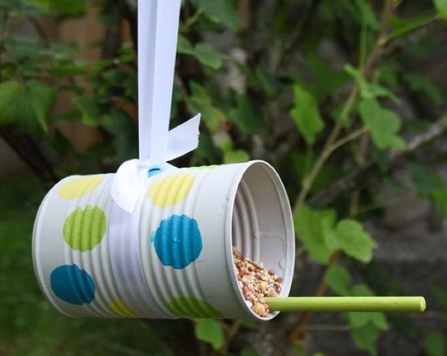 Из консервных банок, вы можете смастерить такие милые кормушки, и еще эти кормушки послужат оригинальным украшением для вашего сада или дворика.