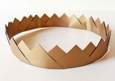 Нам понадобится достаточно плотная бумага цвета золота, из которой нужно нарезать много квадратов одинакового размера. Каждый квадратик складываем пополам по диагонали и склеиваем их между собой, вставляя друг в друга. В итоге у нас получится интересный вариант короны.