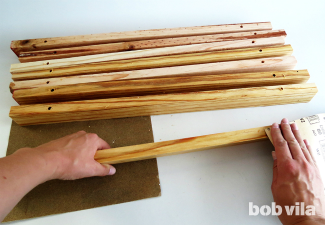 Наждачной бумагой удалите все неровности, шероховатости реек и зачистите сколы вокруг отверстий.