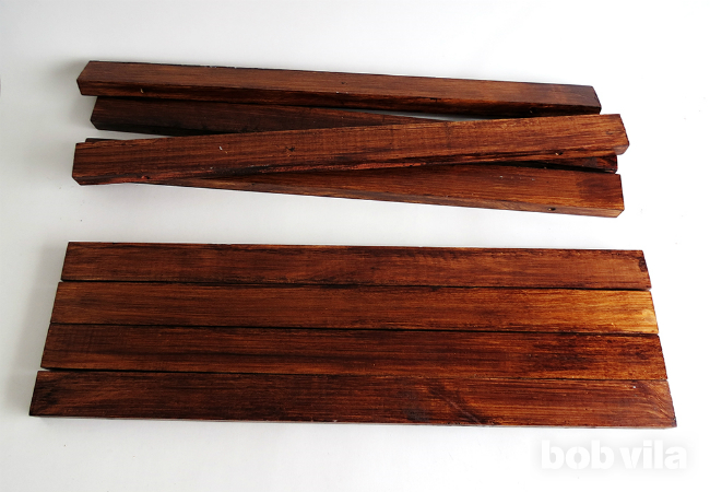 Теперь, приступайте к окрашиванию деревянных реек морилкой в тон, который наилучшим образом дополнит вашу входную дверь. Следуйте инструкциям на упаковке, дайте время высохнуть, прежде чем продолжить.