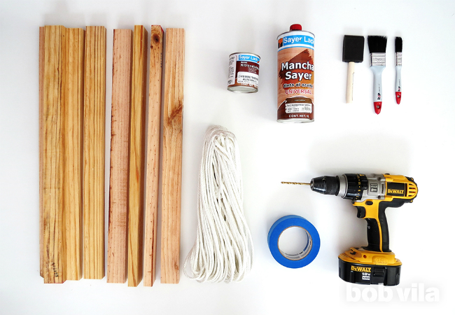 Завяжите узлы на каждой веревке, а затем нанизывайте рейку на веревки. Вы будете чередовать узлы, планка, узлы, планка, пока не дойдете до последней планки.
