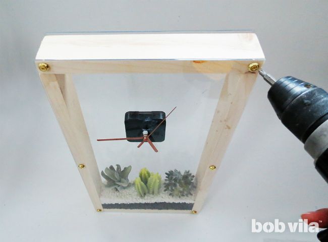 Если вам все понравилось, закрепите сверху последнюю рейку, чтобы закрыть часы. Здесь не следует использовать ни клей, ни гвозди, так что вы сможете легко открыть часы, чтобы заменить батарею. Вместо этого, предварительно просверлите верхние углы акрилового листа (с часами) и дерева, и закрепите шурупом с шайбой. Повторите тоже самое с тыльной стороны. Все, можете водрузить на полку, чтобы следить за временем и любоваться.