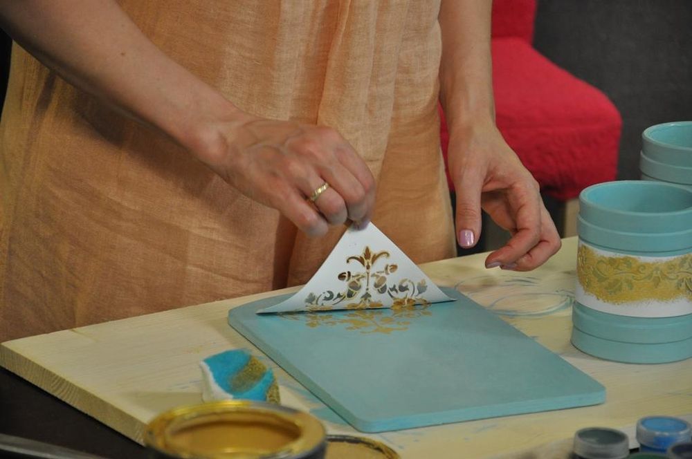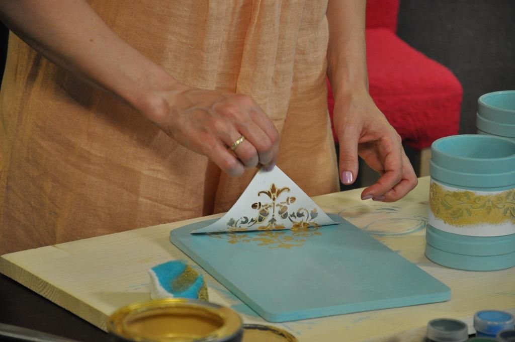 Теперь возьмите трафарет с изображением какого-нибудь узора и осторожно, при помощи губки, нанесите этот узор на верхний край доски и кружки по центру. Краску берите второго оттенка из заготовленных. Чтобы изделие выглядело более нарядным и эффектным, мы бы советовали использовать краску золотого, серебряного или бронзового оттенка. Краски на губку набирайте совсем чуть-чуть, чтоб она не подтекла и не испортила все дело.