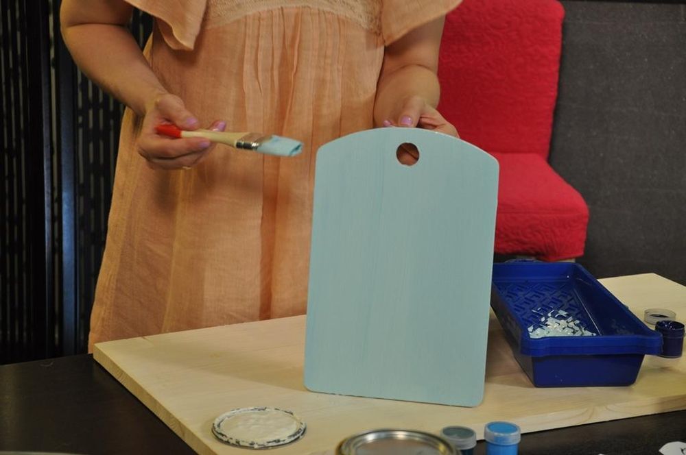 Первый шаг – покрываем краской кружки и доску. Оттенок берите такой, чтоб подошел интерьеру вашей кухни или резко контрастный.