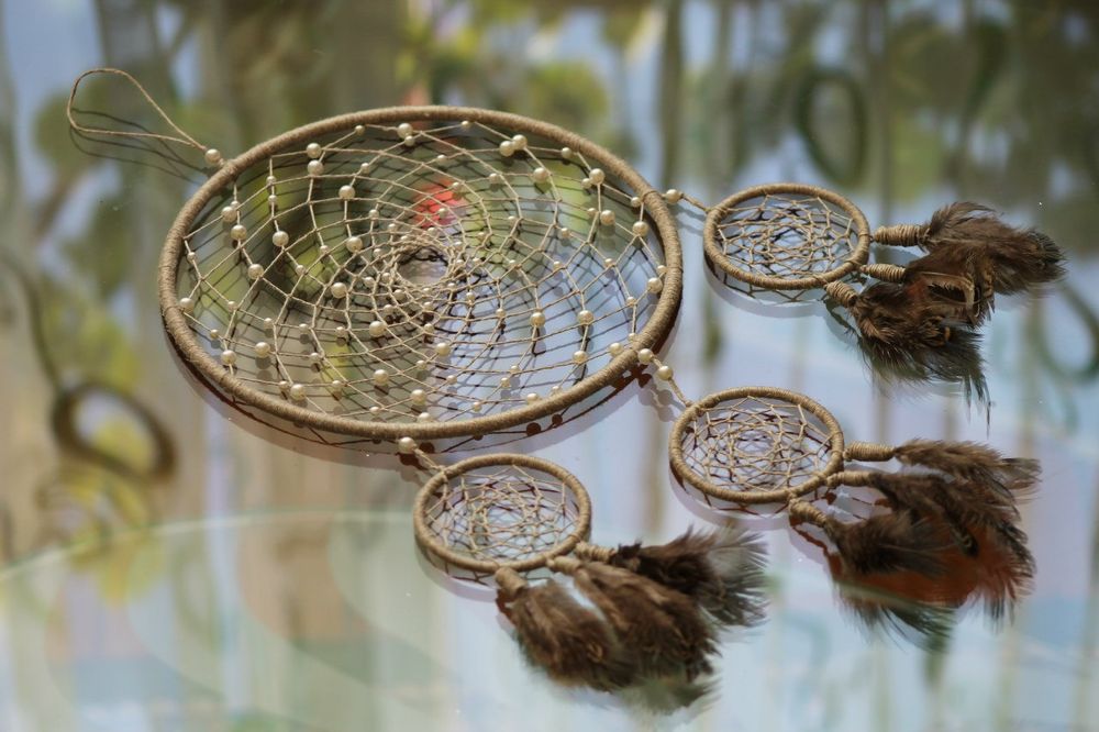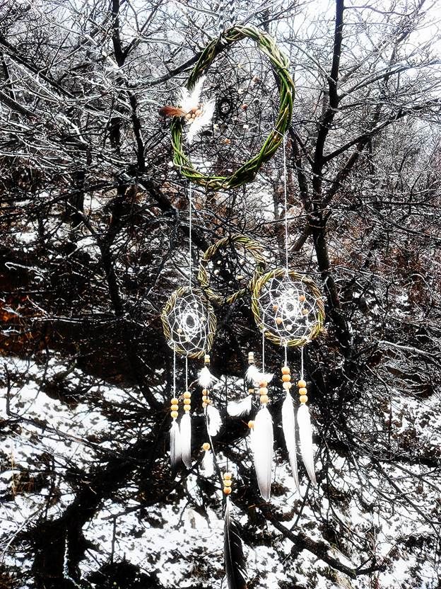 К Большому ловцу снов снизу подвешиваем маленькие, зацепив нитью за ивовый обруч. Разместите их красиво и симметрично друг другу, возможно на разной высоте![]()