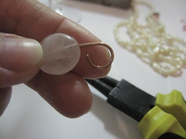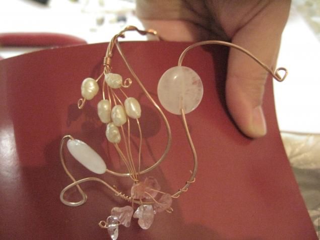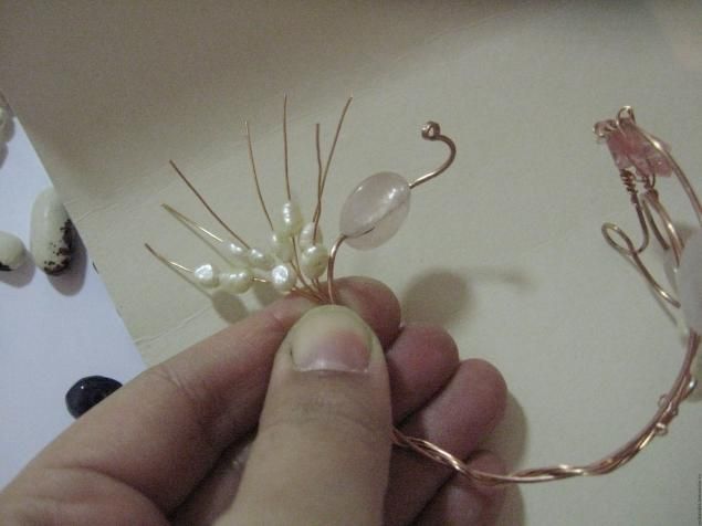 и добавим красы . Верх соберем и на получившихся новых растопырках разместим скол розового кварца. Жемчужины проденем на каждый усик и формируем веточку .