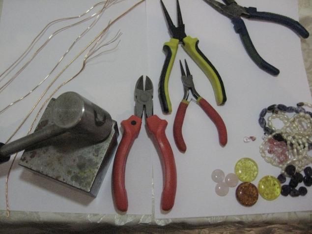 Мне понадобились из всего ,что на картинке только круглогубцы и бокорезы и еще на молоток и на ручку молотка я загибала проволоку .