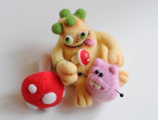 Техника сухого валяния или фелтинг позволяет создавать весьма замысловатые формы и фигурки, только «лепить» их нужно не из глины или пластилина, а из непряденой шерсти. Ознакомившись с базовыми приемами валяния и попробовав на практике создать самостоятельно простую фигурку, можно переходить к более сложным формам. В этом мастер классе я предлагаю вам продвинуться дальше в изучении этого интересного вида рукоделия на примере забавного монстрика. По аналогичному принципу свалять можно, разумеется, любую другую зверушку или человечка, воспользовавшись собственными идеями и эскизами.
