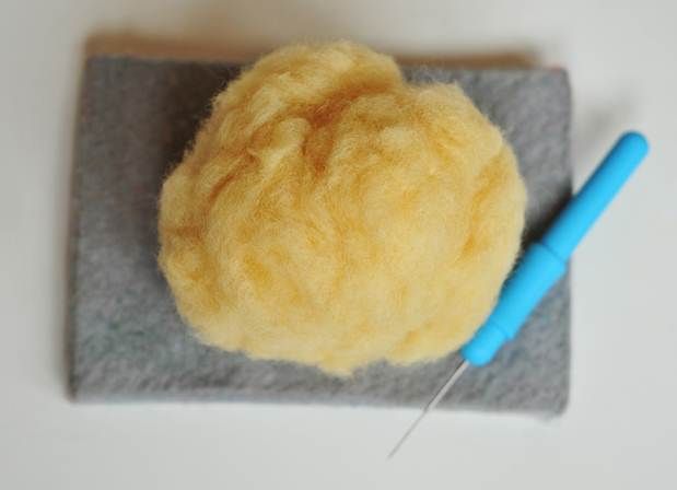 Если в процессе работы вы поняли, что получающаяся форма вас не совсем устраивает, отчаиваться не стоит, так как эти недостатки достаточно легко поправить. Например, я решила сделать своему монстрику небольшое пузико. Для это мне понадобится сделать отдельное «облачко» из шерсти, предварительно совсем немного сваляв его на подложке. Аккуратно приваливаем получившуюся накладку на нужное место, приходясь иголкой для валяния по кругу.