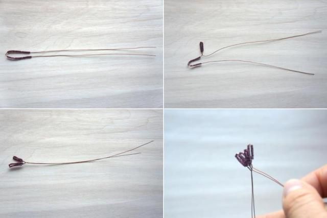 Наденьте около 35 бусин на проволоку длиной в 40 см, а именно на ее центр. Поделите рубку на 2 половины - таким образом у вас получится 2 лавандовых лепесточка.