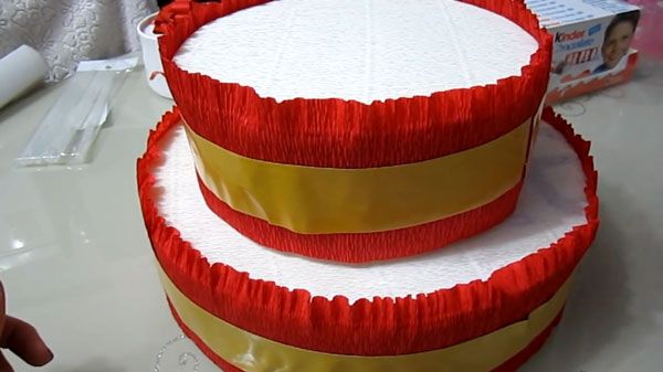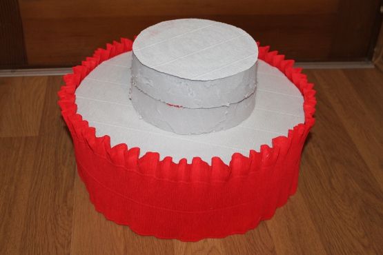 Сделайте также другой ярус в форме окружности меньшего диаметра. Приклейте картонное дно к основе. Оберните с помощью гофрированной бумаги оба яруса, закрепляя ее в нескольких местах.