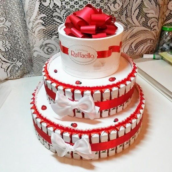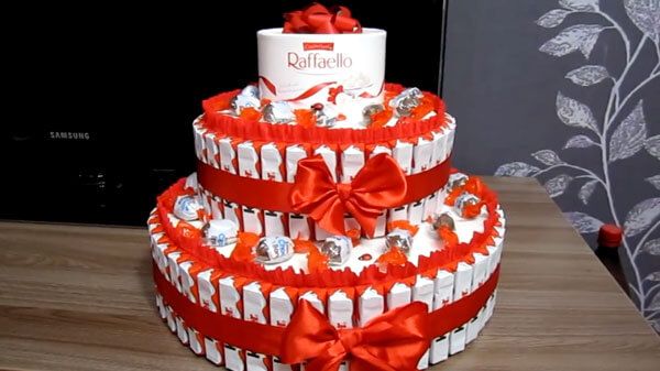 Теперь приступим к работе с шоколадками - вам нужно нанести клей на их заднюю часть немного клея и прижать шоколадки к базе торта. Таким образом, заклейте всю площадь основы. Затем, обклеив обе основы шоколадками, украсьте их, обвязав при помощи атласных ленточек. В качестве завершающего шага, вам необходимо установить коробку «Raffaello».