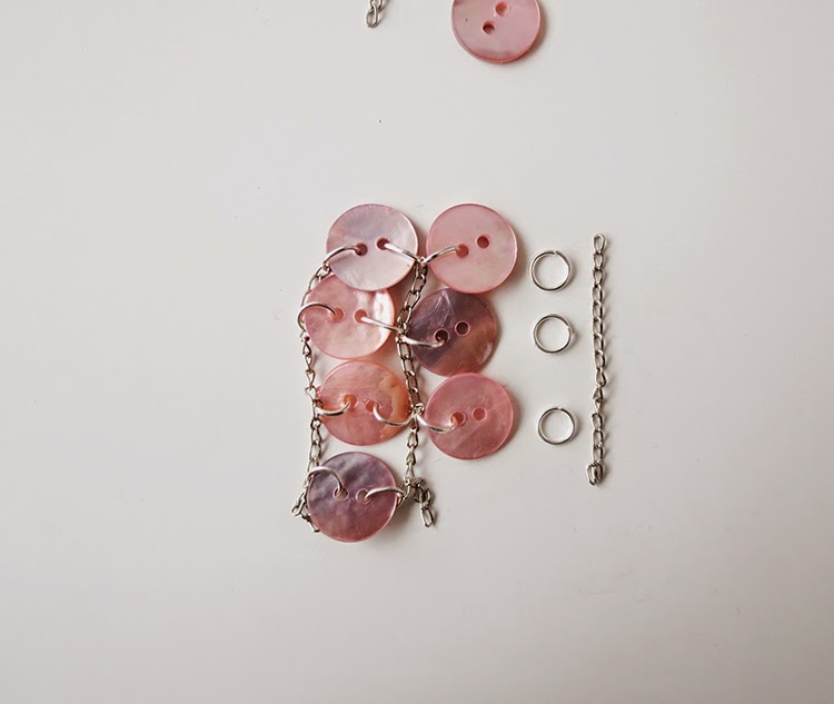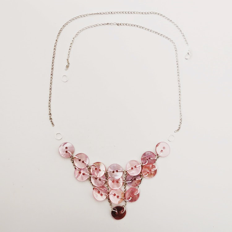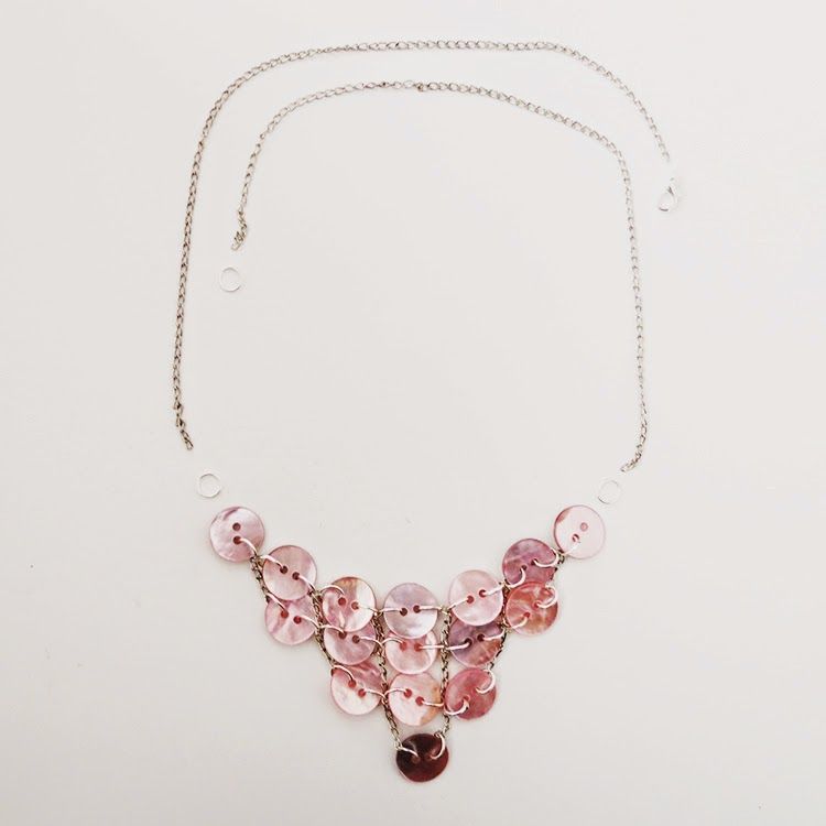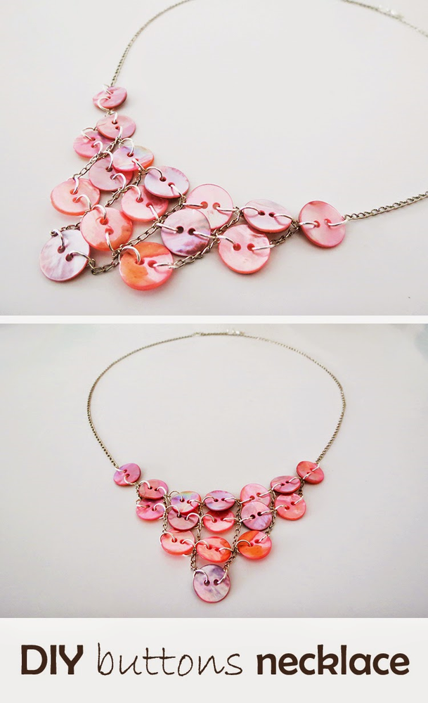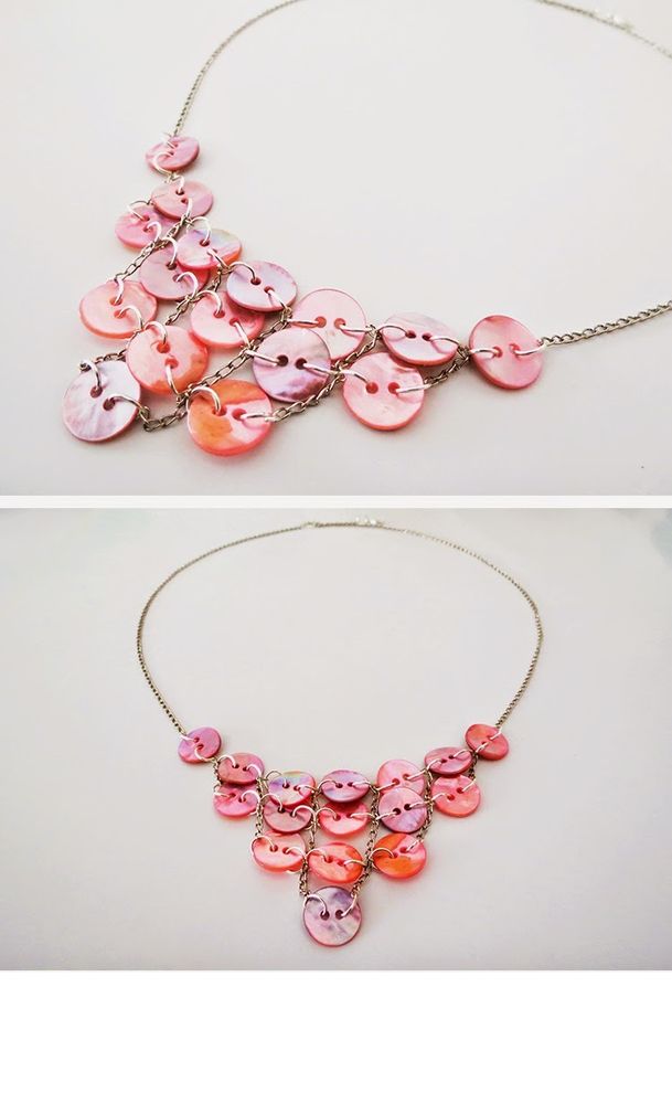 Я уверена, что у каждой из вас дома есть много пуговиц. Почему бы не использовать их, чтобы сделать довольно милое ожерелье? Вам понадобится: перламутровые пуговицы, цепь, соединительные кольца для бижутерии, карабин и круглогубцы.