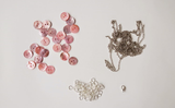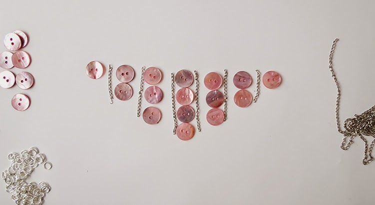 Разместите пуговицы и кусочки цепи рядами.