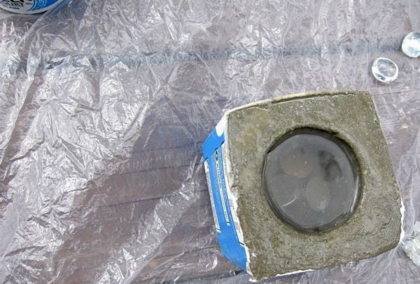 После заливки бетона, заполните стеклянный стакан кучей монет и воды, чтобы вдавить его вниз в бетон.