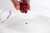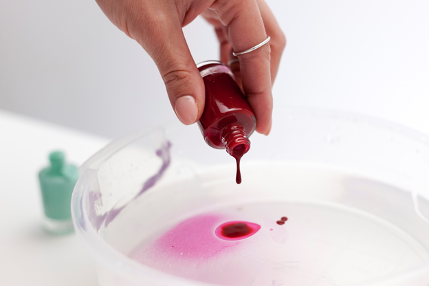 2. В емкость с теплой водой добавьте по капле лак, того цвета, который вы выбрали. Цвет один или сразу несколько по желанию. Если вы хотите сделать более прозрачный тон, то добавьте всего 2-3 капли, а для создания более насыщенного оттенка – 5 и более.
