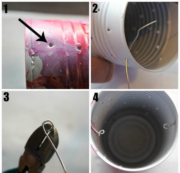 (1) Используя тот же гвоздь и молоток, проткните отверстие в верхней части банки с одной и с противоположной сторон для проволоки.