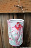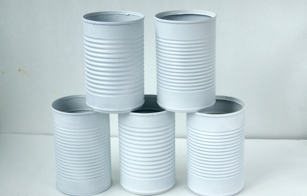 1. Вымойте и высушите ваши жестяные банки, снимите всю бумагу и клей с внешней стороны. Затем, аэрозольной краской покрасьте ваши жестяные банки в белый цвет. Также сбрызните немного внутри.