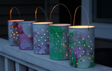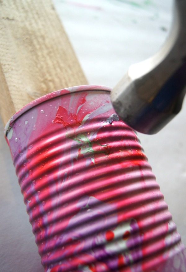 3.После высыхания, пришло время пробить отверстия в банке. Используя, маленький деревянный брусок, пробейте гвоздем отверстие. Продолжайте забивать гвоздь и делать отверстия произвольно или согласно схемы по всей поверхности банки. Повторите процесс со всеми банками.